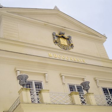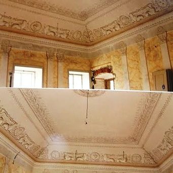 The work was carried out in two stages in the years between 1998 and 2000. Stage one involved renovation of the interior. Restoration work was targeted mainly on examination and the subsequent renovation of the original wall decoration, which was uncovered under more recent layers of overpainting. Other specialist tasks concerned stucco renovation and conservation of the original pillars in the castle’s corridor and of two fireplaces. Some demolition work was undertaken to remove unsuitable later partitions in some rooms of the castle. Carpentry work was required mostly within the side wings of the building, where the wooden doors were newly recessed. Metal work involved repairs to the original metal fittings of the doors and manufacture of copies where required. The aim of the reconstruction of the façades was to recreate their Empire style appearance, which they acquired during the rebuilding of the castle in 1839. We also participated in the repairs of the courtyard fountain and work in the cour d’honneur (Court of Honour). All intervention had been approved by the staff of the National Heritage Institute office in Plzeň.