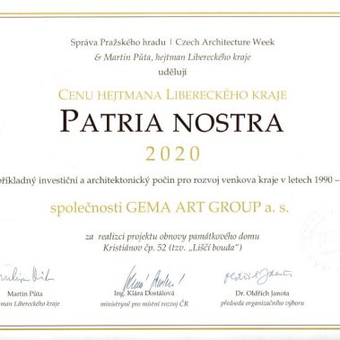 Almost ninety projects were nominated for the PATRIA NOSTRA Award. This award is given for an exemplary investment and architectural achievement contributing to the development of the countryside and satisfying the needs of its inhabitants and visitors in individual regions of the Czech Republic, implemented in the years 1990–2020. The management of the region selected one building and its creator from the constructions nominated by professional departments for the PATRIA NOSTRA award for the award given by the governor of the region.