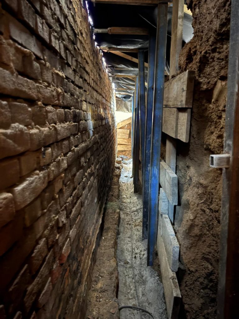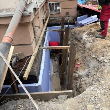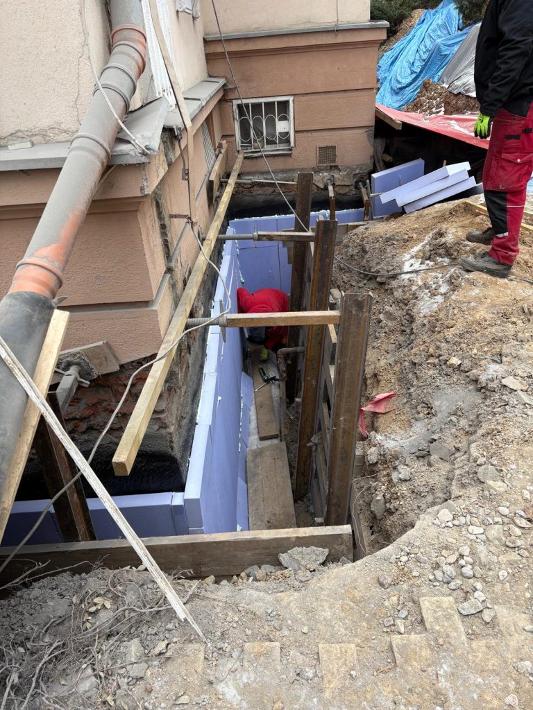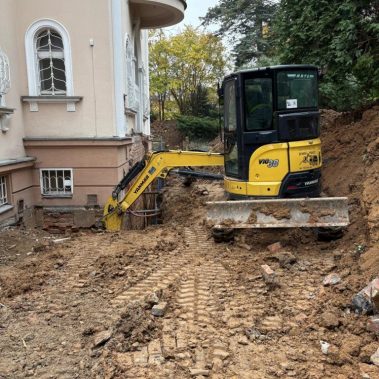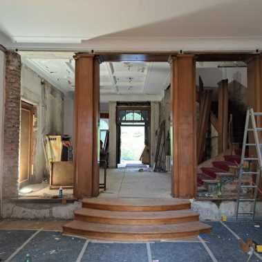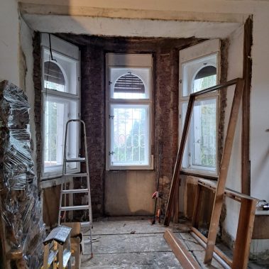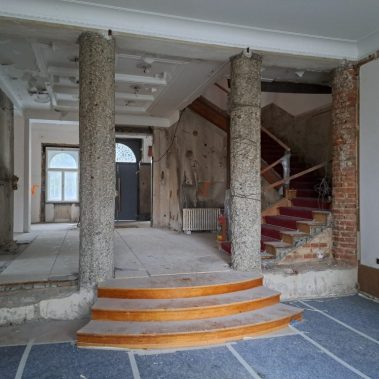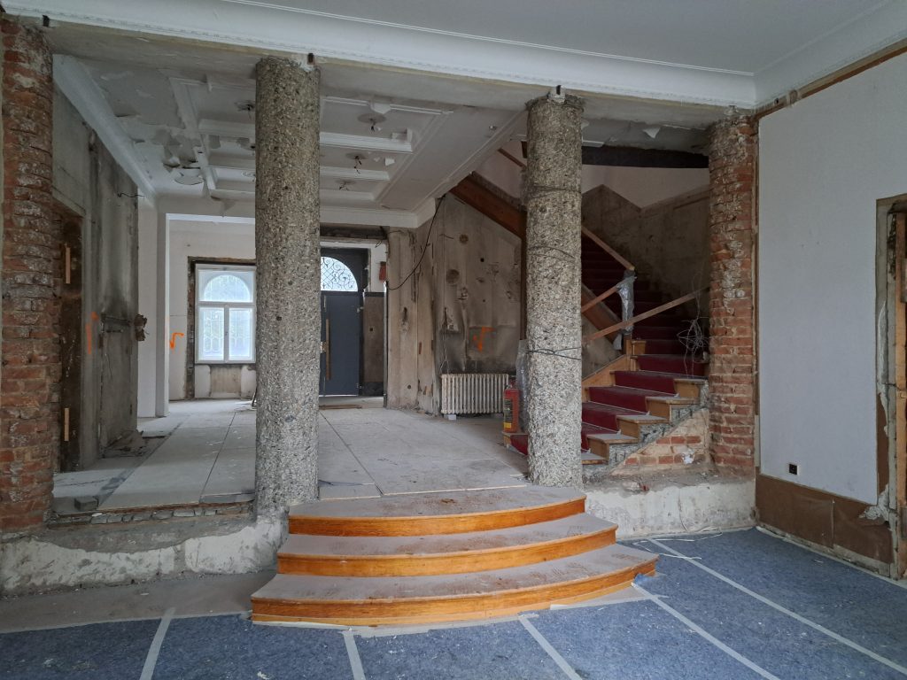 The subject of the work being carried out is the comprehensive revitalization of the entire building. The work therefore includes the remediation of the foundation masonry against moisture, the reconstruction of the roof trusses and roof, extensive modifications to the interior structures, and the installation of all utilities.
