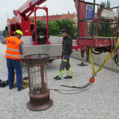 Aby byl zachován historický charakter mostu bylo rozhodnuto jej osadit upravenými kopiemi historizujících luceren z Mánesova mostu v Praze. Tento typ upravené bronzové lucerny odpovídá světelně-technickým požadavkům současnosti. Výrobu replik historizujících luceren a jejich montáž provedla firma Pasířství Houska & Douda spol. s r.o. Elektrovýzbroj svítidel, revize a připojení do městské sítě veřejného osvětlení hlavního města Prahy bylo realizováno ve spolupráci se společnostmi ELTODO a.s. a ELTODO-CITELUM s.r.o.