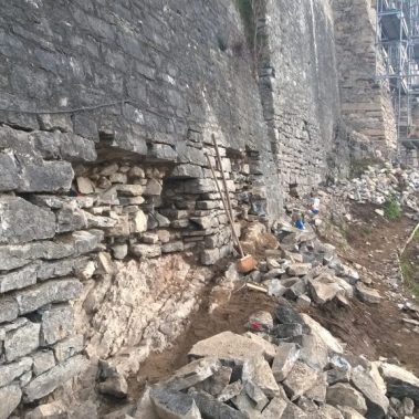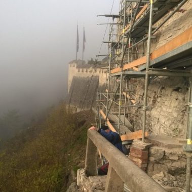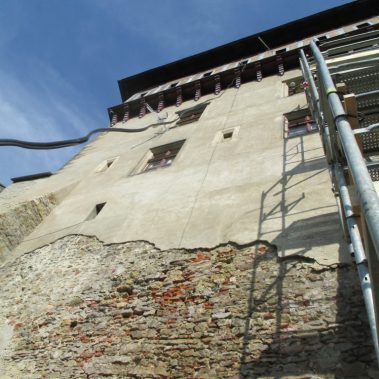 Společnost GEMA ART GROUP a.s. se na Karlštejně průběžně podílela na realizaci mnoha projektů. V letech 2014-2015 realizovala na této památce odborné konzervátorské a stavební práce na zajištění opěrných pilířů hradeb přiléhajících k purkrabství. Práce byly realizovány podle projektu ing. Víta Mlázovského a pod dohledem Národního památkového ústavu. Historické hradební zdivo je po léta vystavováno řadě činitelů způsobujících postupnou degradaci jeho pevnosti. Jedná se především o narušování náletovými dřevinami a působením klimatických změn. Z uvedených příčin degradace, byly práce zahájeny odplevelením svahu pod hradebním zdivem, plošnou úpravou terénu a stavbou konstrukčního lešení, které umožnilo práce na vnějších hradbách. Následné práce byly zaměřeny na odstranění náletových rostlin, vyčištění trhlin, odbornou sanaci zdiva, injektáže, jádrové vrtání a kotvení zdiva, doplnění kamenného, smíšeného a haklíkového zdiva. V závěrečné fázi odborných prací bylo provedeno nové spárování hradebního zdiva a jeho ošetření proti klimatickým vlivům.
